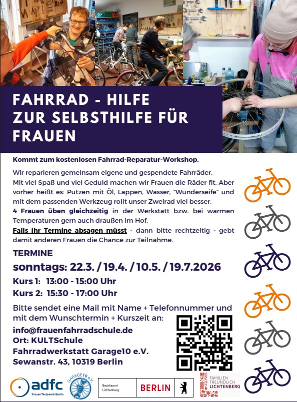 Wir sind eine Berliner gemeinnützige Fahrradwerkstatt für Geflüchtete und Bedürftige.sowie Selbsthilfewerkstatt für alle. Ihr findet uns in der KULTSchule in der Sewanstraße 43 in Berlin Lichtenberg.